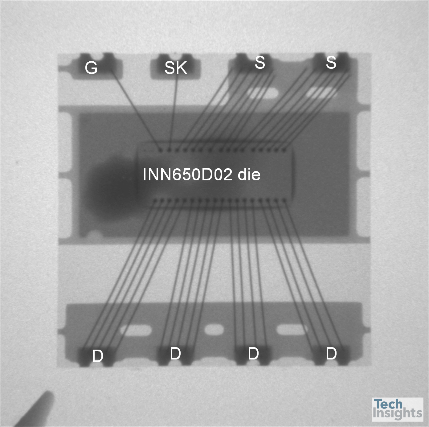 The Innoscience INN650D02 was removed from the PCB for further analysis. Figure 4 presents a plan-view X-ray of the INN650D02 package. A single die is seen in the middle of the package, connected by bond wires to source (S), drain (D) and gate (G) pins. An SK monitoring pin is also provided. Decapsulation in the TechInsights labs revealed the die, which has a “F1” marking in the bottom left corner, as shown in Figure 5. The drain pads are located along the bottom edge of the die, while the source and gate pads are located at the top edge. The high electron mobility transistor (HEMT) gate fingers run vertically across the die.