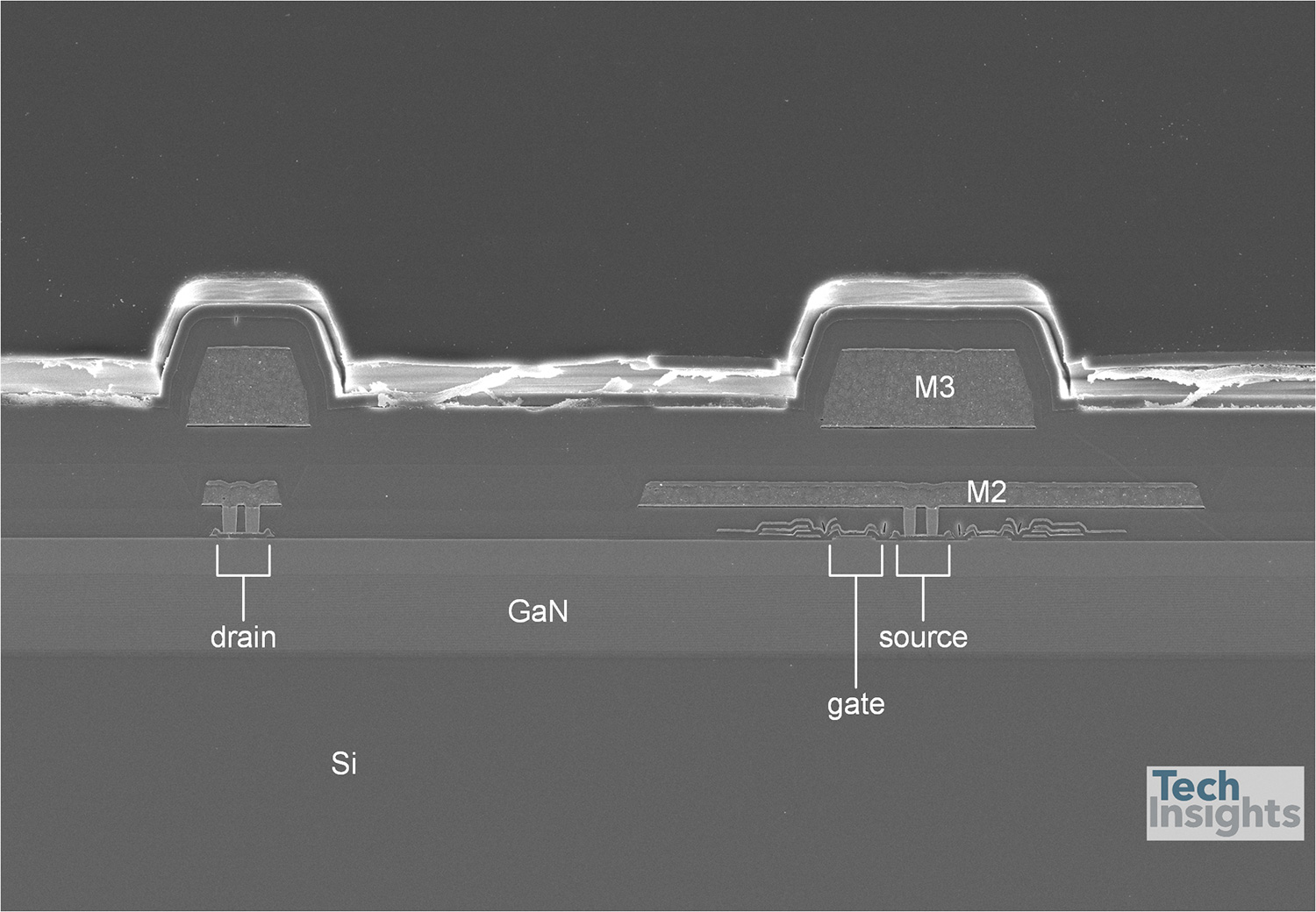 Figure 6 shows a SEM cross-sectional view of the INN650D02 F1 die structure. The device uses four levels of metallization, including a metal 0 substrate contact layer and a metal 1 gate contact layer, on a GaN-on-Si substrate. The gates are formed as mesas of likely P-type GaN.